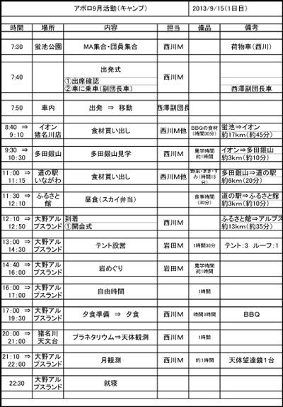 アポロ隊9月活動『キャンプ』日程表が完成致しました。