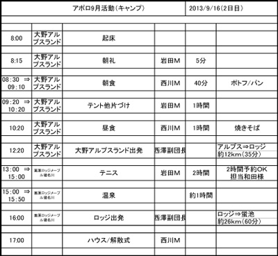 アポロ隊9月活動『キャンプ』日程表